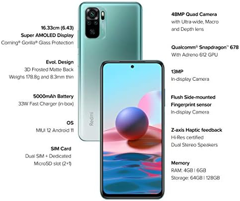 Colour:Aqua Green | Size name:128 GB FHD+ (1080x2400), 6.43 inch large AMOLED Dot display with 20:9 aspect ratio ensures superior multimedia viewing experience . Qualcomm Snapdragon 678 octa-core processor with 11nm process technology coupled with latest MIUI 12 (Based On Android 11) enables low power consumption for a longer battery life and immersive user experience as well as great performance. 48MP Quad camera setup facilitates user to capture high resolution photographs with greater detail in almost all lighting conditions as well as scenarios. Comes with support for Ultra wide, Macro and Portrait with several modes in the camera app which enhances the photography experience. Massive 5000 mAh battery bundled with 33W fast charger in-box boosts the charging speed as well as provides great battery backup Note:Incase of any issue with the product, kindly contact brand at 1800 103 6286 between Service hours: 09:00-21:00.